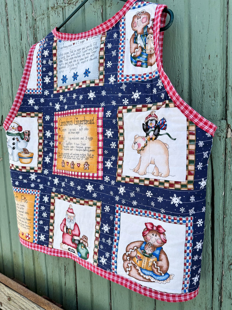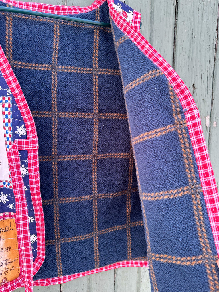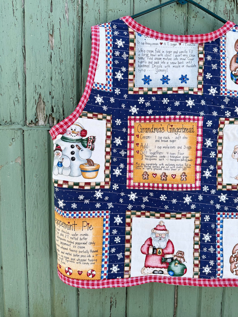 Adult large vintage recipes vest. This is a one of a kind make from vintage Christmas fabric featuring fun holiday themed recipes. The lining is a navy blue gold stripped Sherpa. Front tie closure.